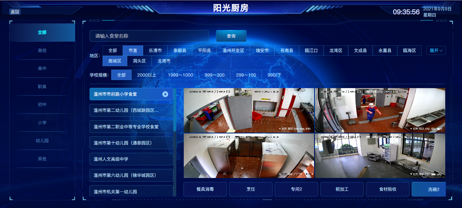 “監管人員通過校園食品安全智治平臺,可以清晰看到各個學校食堂的后廚情況,實時查看原料清洗、切配、烹飪、專間、餐具消毒等各個環節的動態,同時AI抓拍設備能夠自動抓拍從業人員未穿工作服、抽煙、未戴口罩、玩手機、未戴帽子等不合規行為,物聯感知設備能夠對專間溫度、紫外線燈消毒、餐飲具消毒、冰箱溫度等進行自動監測,并納入24小時全天候監管。”溫州市市場監管局餐飲處工作人員介紹道,“校園食品安全智治平臺”分為基礎數據、陽光廚房、主體智控、食材供應、監管情況五個模塊,通過場景化可視化的方式,全面展示從業人員健康管理、加工操作行為、后廚環境設備、和食安臺賬動態落實情況,借助數字化改革實現對食品安全主體責任精準智控和校園食品安全數字共治。