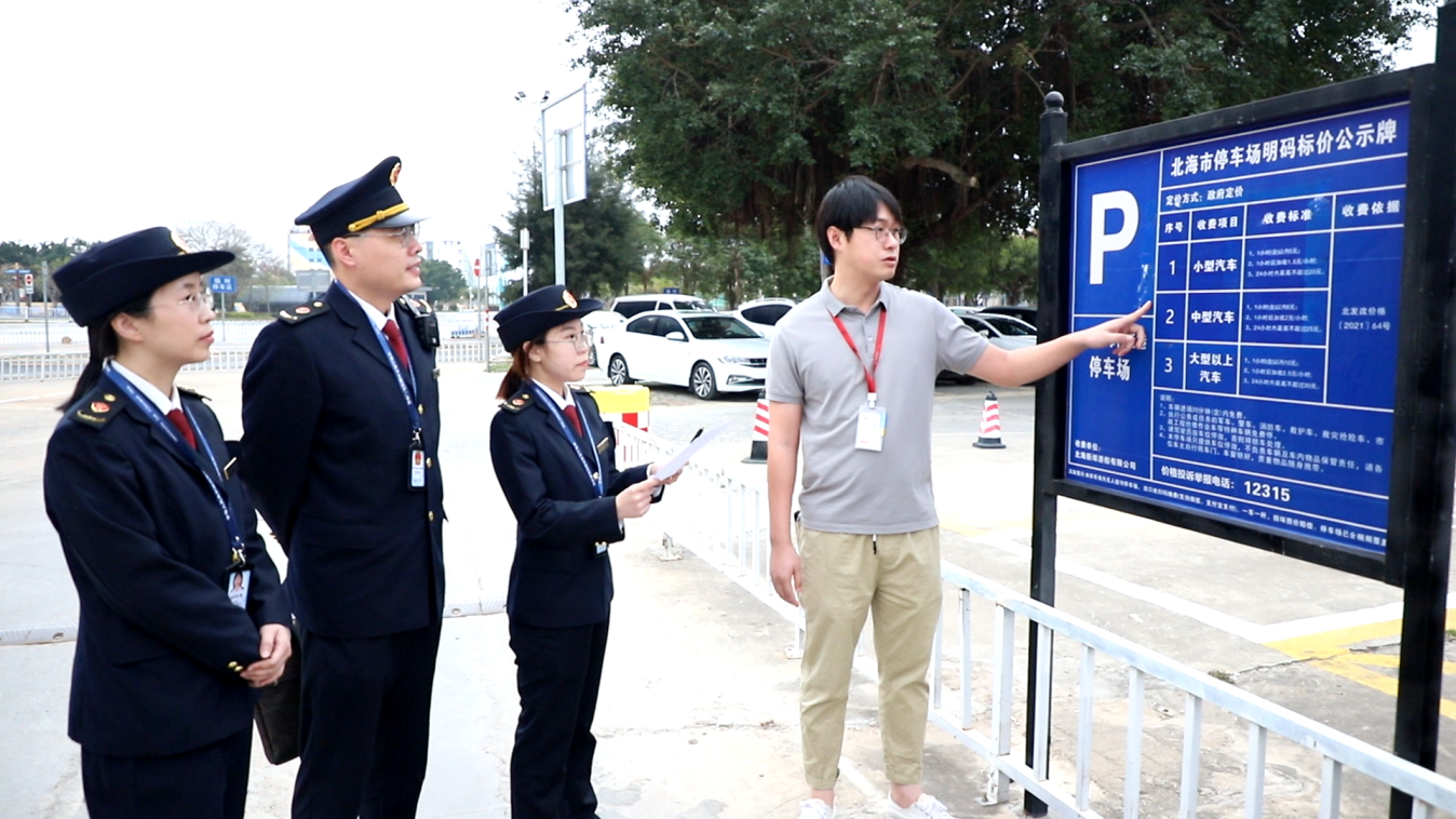 在北海國際客運碼頭停車場,北海市場監管局執法人員正在現場查看明碼標價公示牌和收費系統,檢查該停車場是否執行政府定價,是否按規定明碼標價。該停車場的負責人說:“市場監管局經常來幫助我們規范收費服務,現在我們停車場再沒有收到客人關于停車收費的投訴了。”
